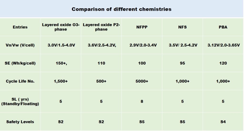 Descriptions (Cathode/Electrolyte/Anode): Cathode: P, anode: hard carbon , electrolyte: salt+solvent+additive. Seperator: PP/PEMain Features: High voltage, close to that of NCM Challenge/Problems: Contain nickel, high cost; gas accumulating, uncertain long term impact, short cycles; Safety issue. Applications:Standby power