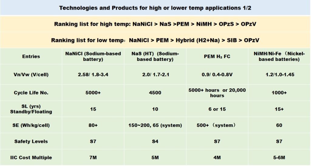 Descriptions (Cathode/Electrolyte/Anode): Mixture of Nickel+sodium chloride+additive/ Sodium tetrafluoroaluminate/ Sodium Main Features: High temperature operation battery. Working temp -40 ℃~65℃; Service life is not affected by temp. Applications:Standby power, BESS, crucial facility, extreme environments;